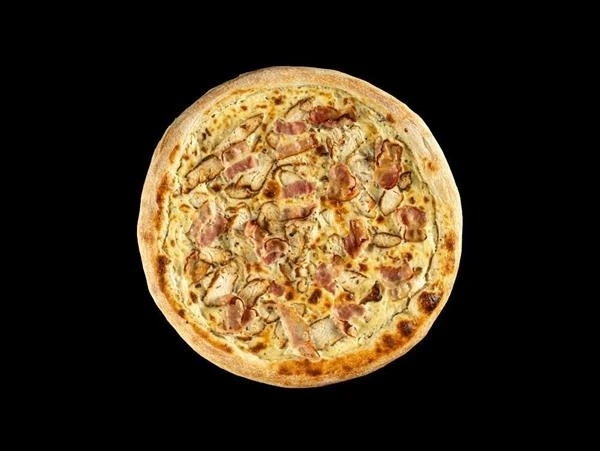 Тесто, соус сливочный, сыр моцарелла, куриное филе, бекон, желтки яйца, прованские травы