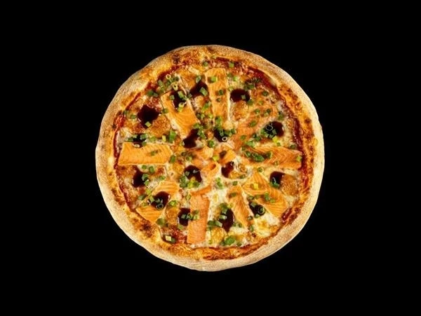 Тесто, соус томатный, сыр моцарелла, лосось, соус терияки, зеленый лук