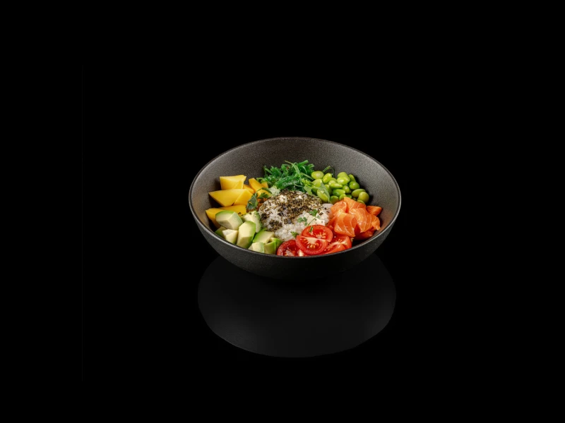 Рис, лосось, томаты черри, бобы эдамаме, чука, манго, авокадо, кинза, соевый соус