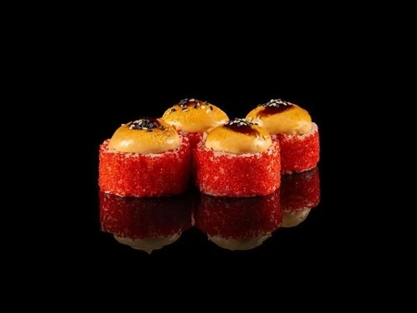 Нори, рис, сыр творожный, угорь, сырная шапочка, огурец, икра масаго, соус унаги