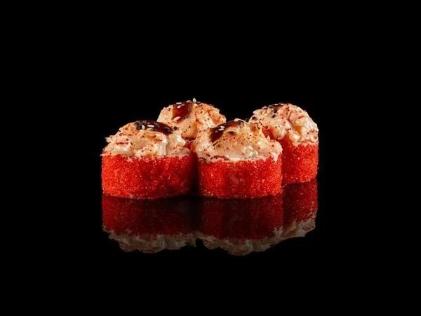 Нори, рис, форель слабой соли, сыр творожный, омлет томаго, огурец, икра масаго, майонез, манго, соус унаги, кунжут