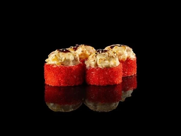 Нори, рис, сыр творожный, омлет томаго , огурец, икра масаго, майонез, снежный краб, сыр моцарелла, соус унаги, кунжут