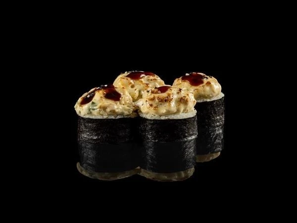 Нори, рис, сыр творожный, омлет томаго, огурец, майонез, угорь копченый, филе куриное, лук зеленый, соус унаги, кунжут