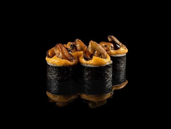 Нори, рис, сыр творожный, омлет томаго, огурец, соус спайси, мидии, лук зеленный, соус устричный, кунжут