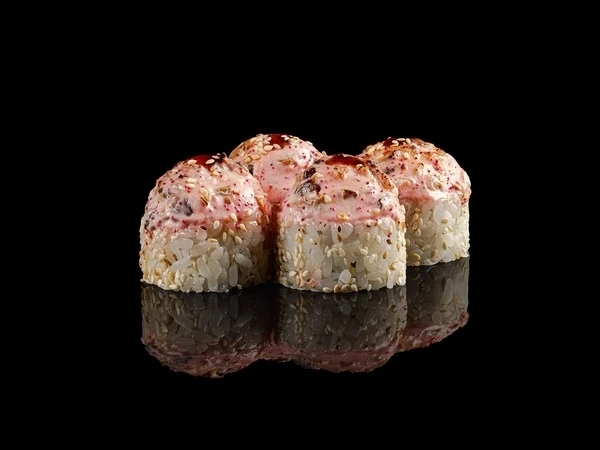 Нори, рис, сыр творожный, грибы шиитаке, угорь, такуан, омлет тамаго, кунжут, соус яки